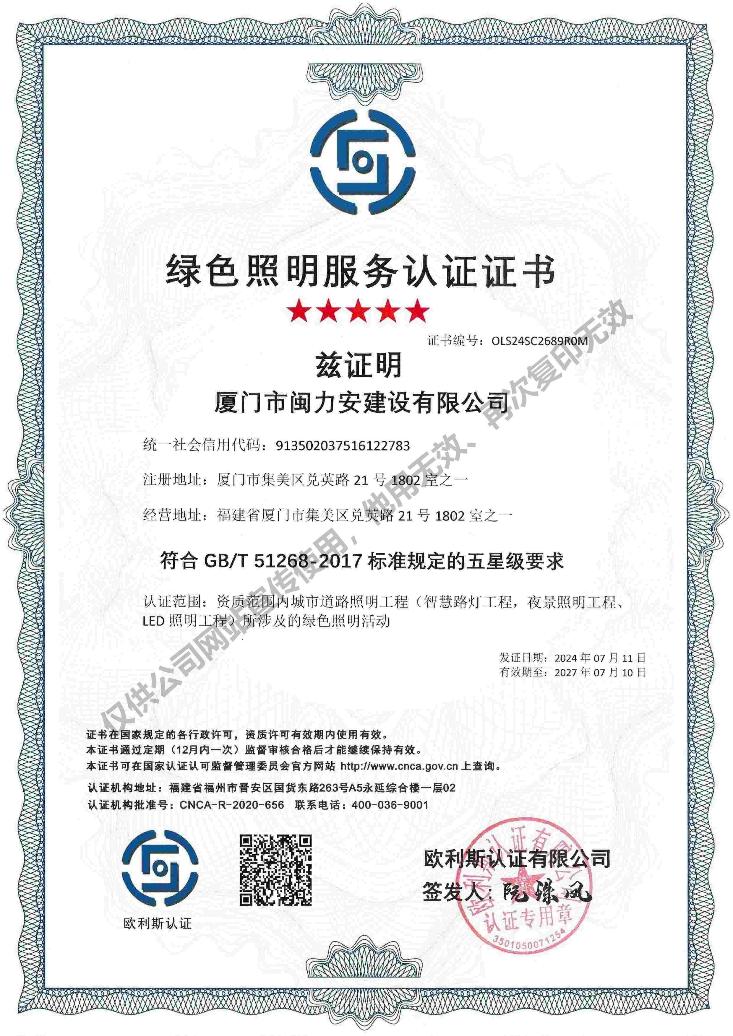 廈門市閩力安建設有限公司成立于2003年,公司取得市政公用工程施工總承包貳級、建筑裝修裝飾工程專業承包壹級、城市及道路照明工程專業承包壹級、電子與智能化工程專業承包貳級、消防設施工程專業承包貳級、電力工程施工總承包叁級、建筑機電安裝工程專業承包叁級、輸變電工程專業承包叁級、環保工程專業承包叁級、照明工程設計專項甲級、建筑裝飾工程設計乙級、施工勞務等資質的綜合型企業,公司于2013年通過了ISO9001質量體系認證,ISO14001環境管理體系認證,OHSAS18001職業健康安全管理體系認證。